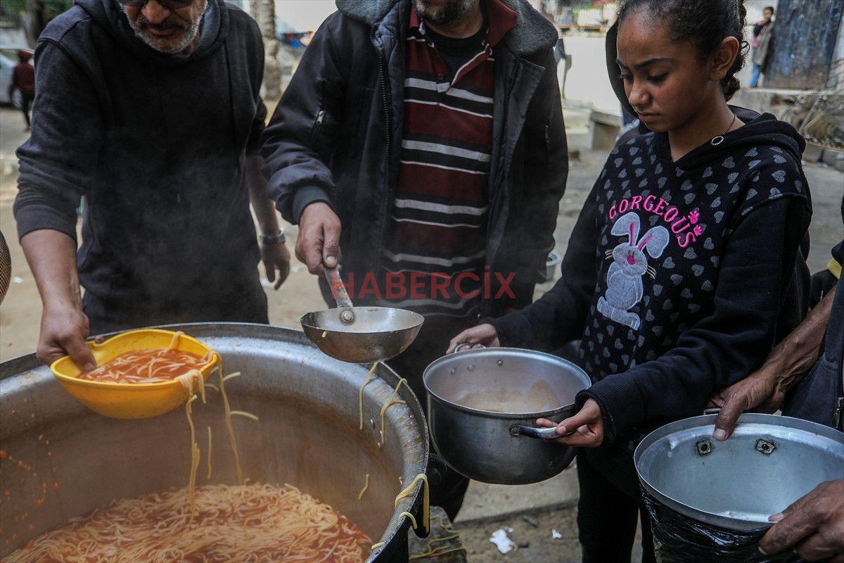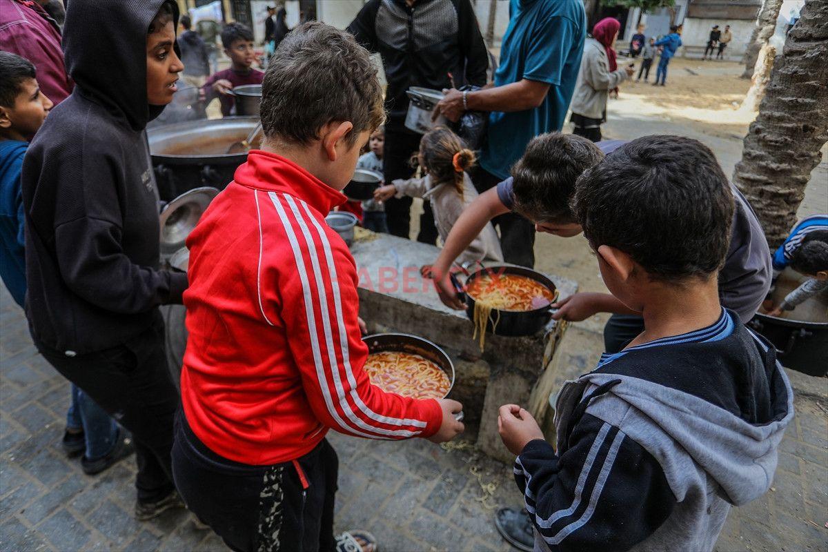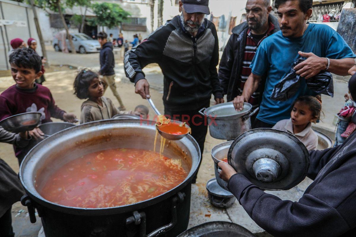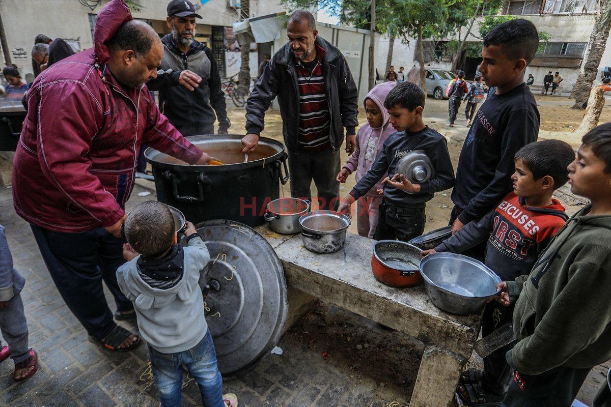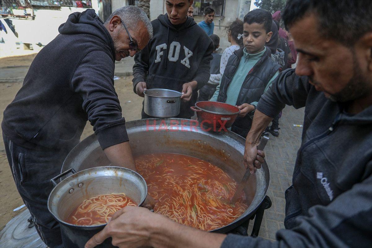 Gazze Şeridi’nin güneyinde bulunan Han Yunus kentindeki el-Mevasi bölgesinde, bir hayır kurumu tarafından İsrail taarruzları sonucu yerinden edilmiş Filistinlilere sıcak yemek dağıtımı yapıldı.