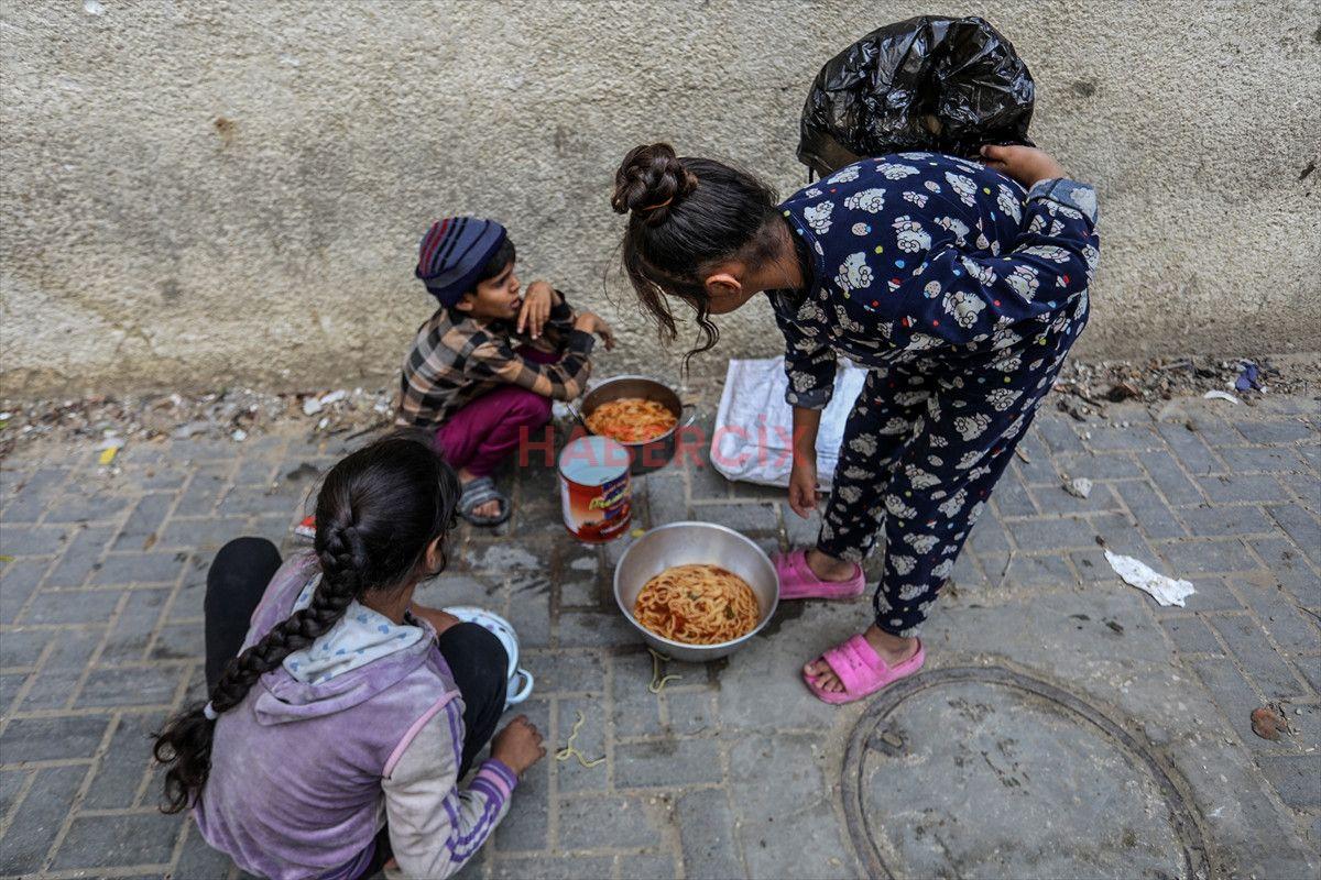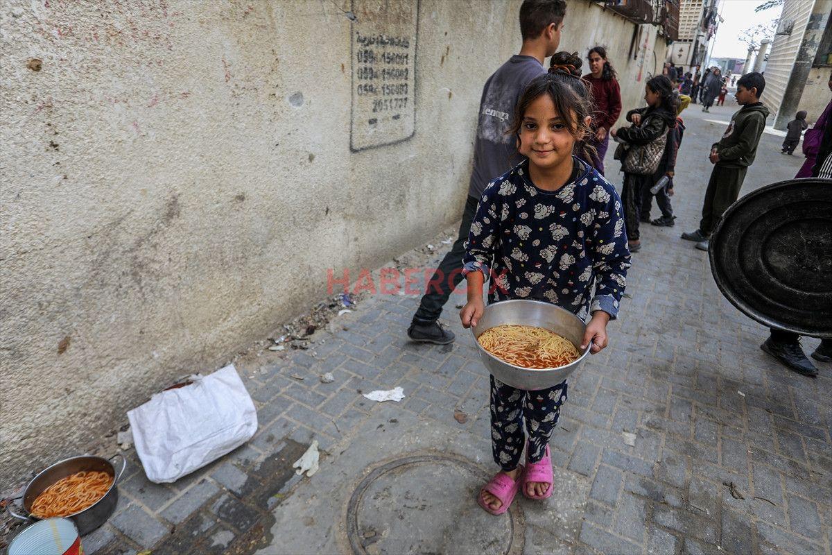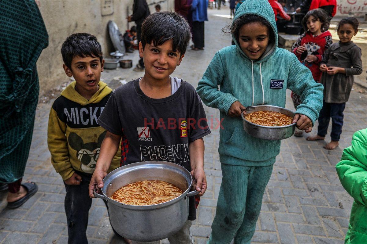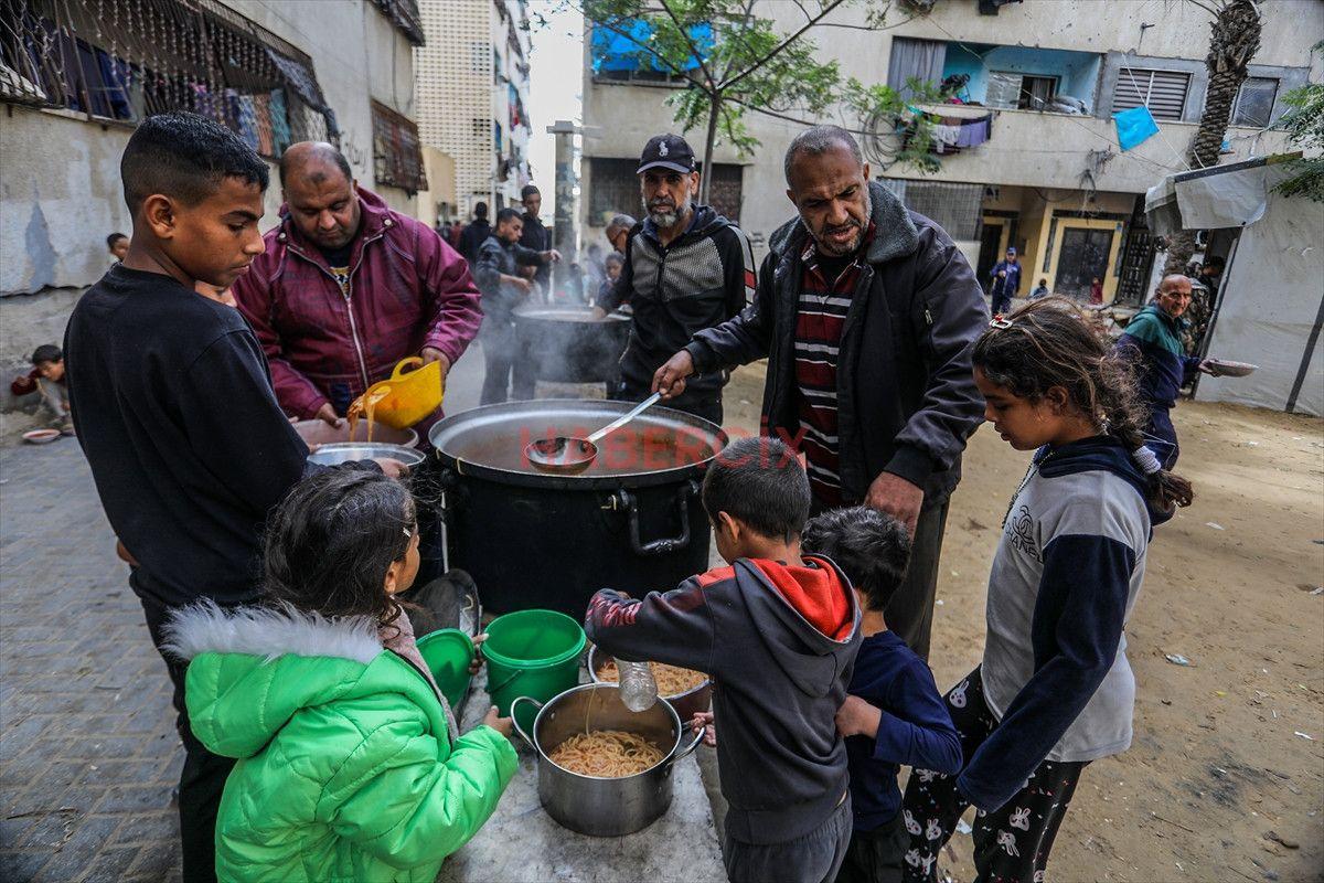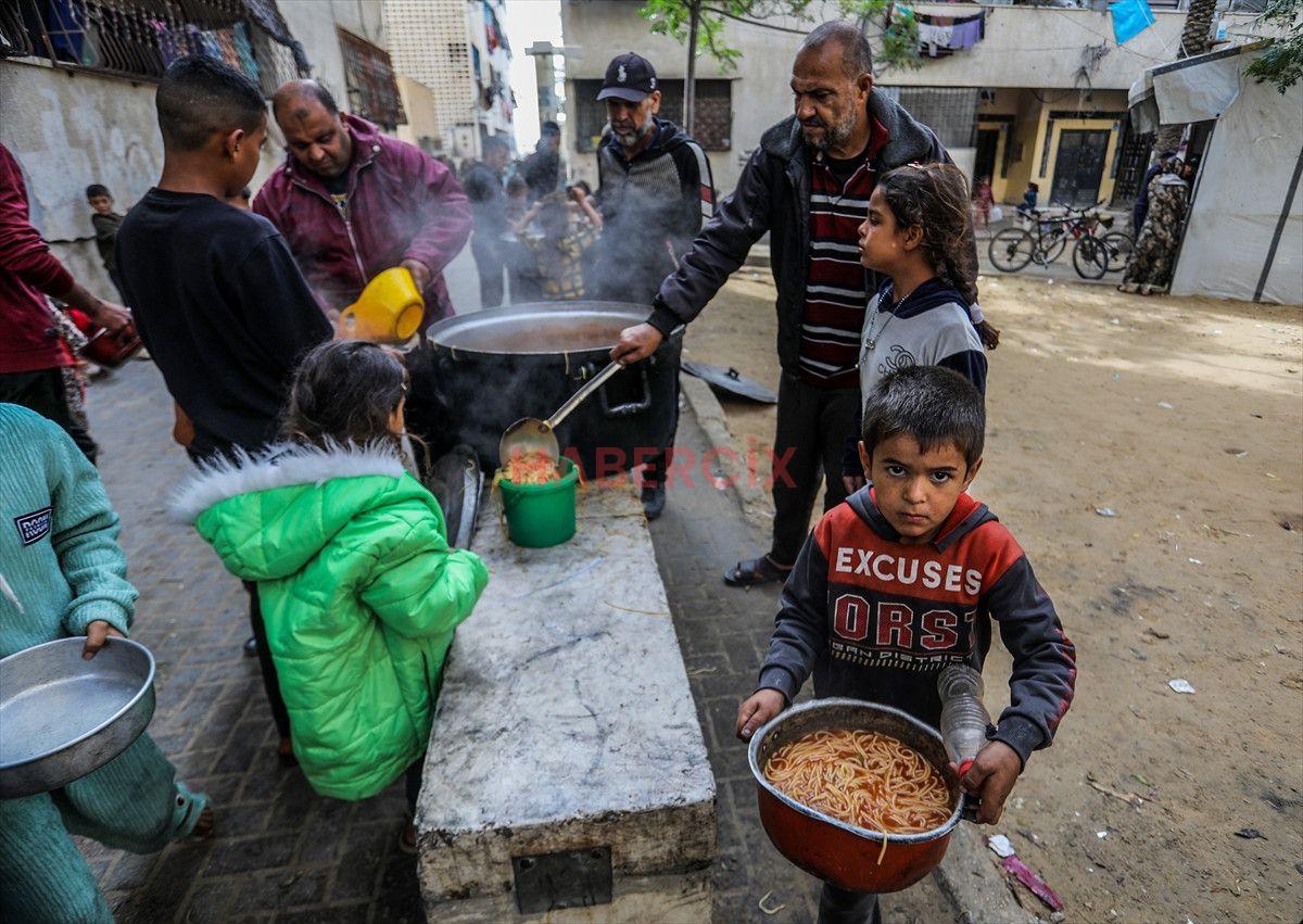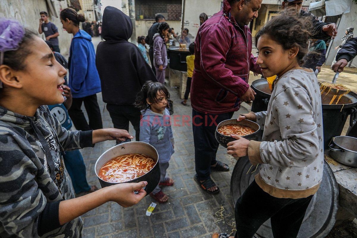 Gazze Şeridi’nin güneyinde bulunan Han Yunus kentindeki el-Mevasi bölgesinde, bir hayır kurumu tarafından İsrail taarruzları sonucu yerinden edilmiş Filistinlilere sıcak yemek dağıtımı yapıldı.