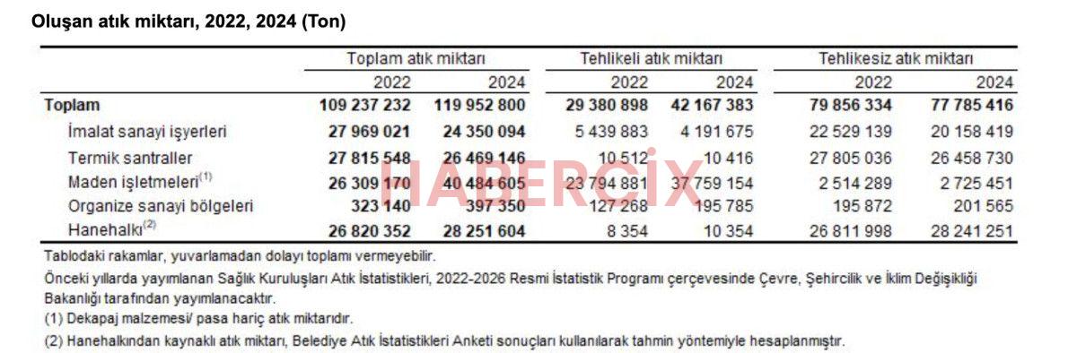 Araştırma kapsamındaki imalat sanayi işyerleri, maden işletmeleri, termik santraller, organize sanayi bölgeleri (OSB) ve hanehalklarında 2024 yılında 42,2 milyon tonu tehlikeli olmak üzere toplam 120 milyon ton atık oluştu.