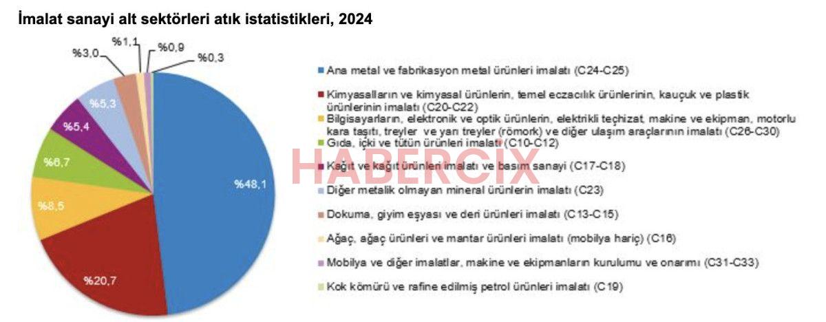 İmalat sanayi iş yerlerinde 4,2 milyon tonu tehlikeli olmak üzere toplam 24,4 milyon ton atık oluştu. Toplam atığın yüzde 70,1’i satıldı yahut lisanslı atık sürece tesislerine gönderildi, yüzde 12,1’i tesis bünyesinde geri kazanıldı yahut dolgu gereci olarak kullanıldı yahut tabiata tekrar kazandırıldı, yüzde 10,8’i sistemli depolama tesislerine gönderildi, yüzde 2,6’sı birlikte yakma (ko-insinerasyon) yahut yakma tesislerine gönderildi, yüzde 2,4’ü belediye yahut OSB idareleri tarafından toplandı, yüzde 1,8’i iş yeri alanında depolandı, yüzde 0,1 ise öbür formüllerle bertaraf edildi.