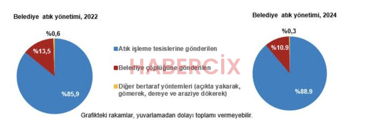 Toplam 1 401 belediyenin 1 392’sinde atık hizmeti verildiği tespit edildi. Atık hizmeti verilen belediyelerde toplanan 32,3 milyon ton atığın yüzde 88,9’u atık sürece tesislerine ve yüzde 10,9’u belediye çöplüklerine gönderilirken, yüzde 0,3’ü ise öbür usullerle bertaraf edildi. Belediyelerde toplanan kişi başı günlük ortalama atık ölçüsü 1,09 kg olarak hesaplandı.
