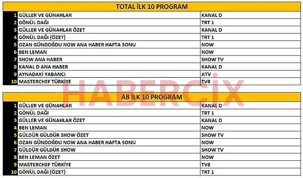 Gönül Dağı, Güller ve Günahlar, Ben Leman, Aynadaki Yabancı dizilerinin yayınlandığı cumartesi akşamları Gönül Dağı uzun müddettir süren kararını yitirdi. Reyting doruğunu Güller ve Günahlar dizisi kaptı ve üç kategoride de tepedeki yerini müdafaaya devam ediyor.