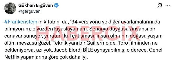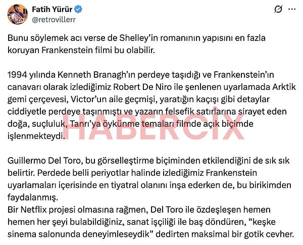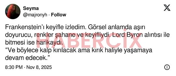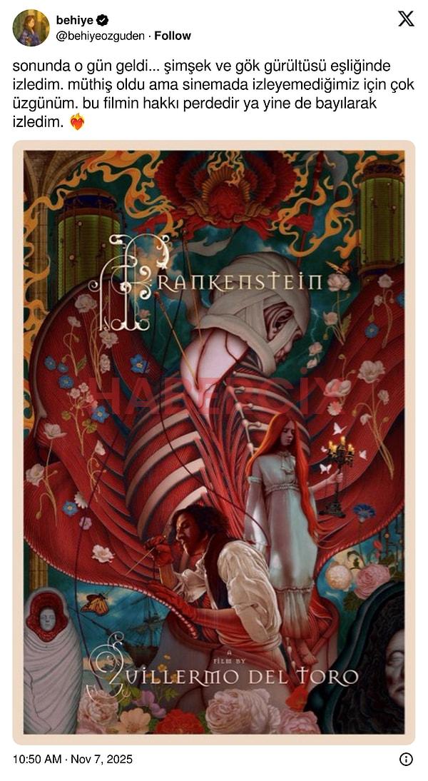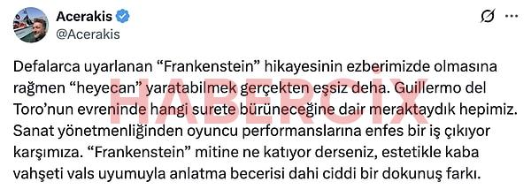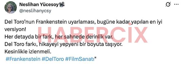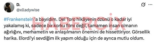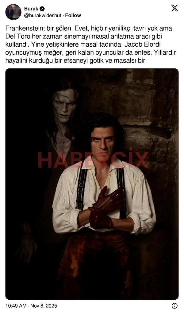 Guillermo del Toro’nun yazıp yönettiği Frankenstein filmi 7 Kasım Cuma günü izleyiciyle buluştu. Başrollerini Oscar Isaac, Jacob Elordi, Mia Goth’un paylaştığı film öyle büyük bir etki yarattı ki tüm sosyal medyada o konuşulur oldu. Film, yayınlanalı ilk iki gün olmasına rağmen büyük bir izleyici elde etti ve izleyiciden tam not almayı başardı.