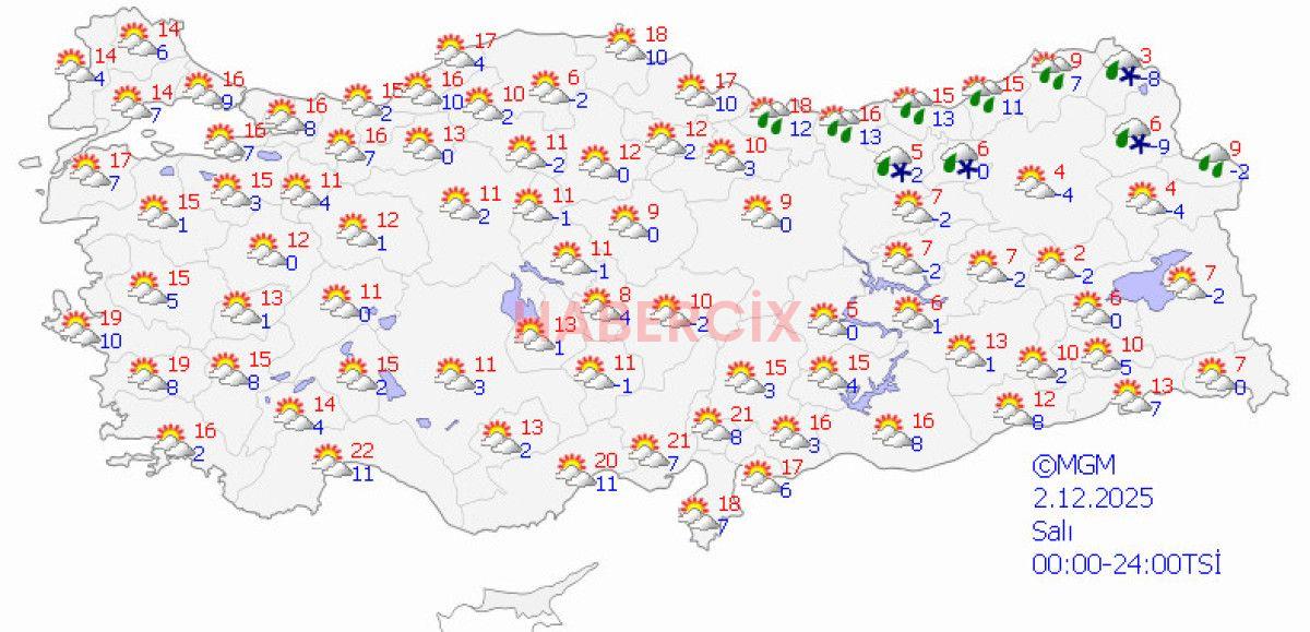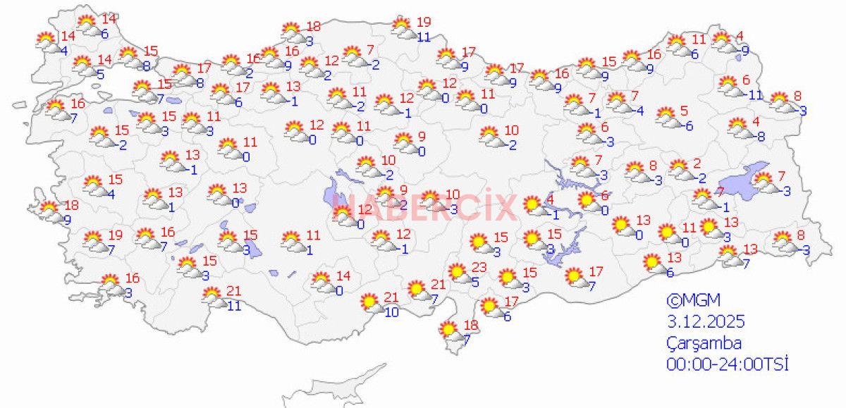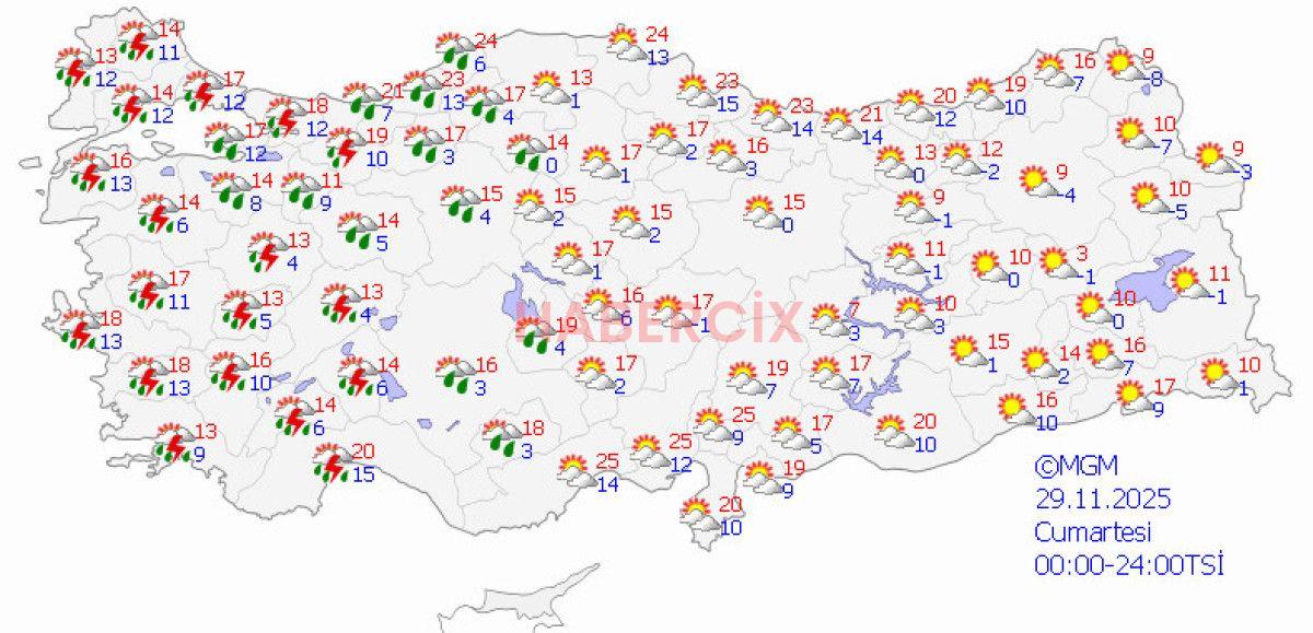 Çevre, Şehircilik ve İklim Değişikliği Bakanlığı Meteoroloji Genel Müdürlüğü’nden yapılan açıklamaya nazaran cumartesi günü yurdun kuzey, iç ve batı kısımları modüllü yer yer çok bulutlu; Marmara, Ege (Kütahya hariç), Batı Akdeniz, İç Anadolu’nun batısı ile Batı Karadeniz’in batısında sağanak ve gök gürültülü sağanak bekleniyor.