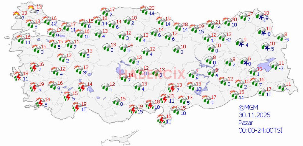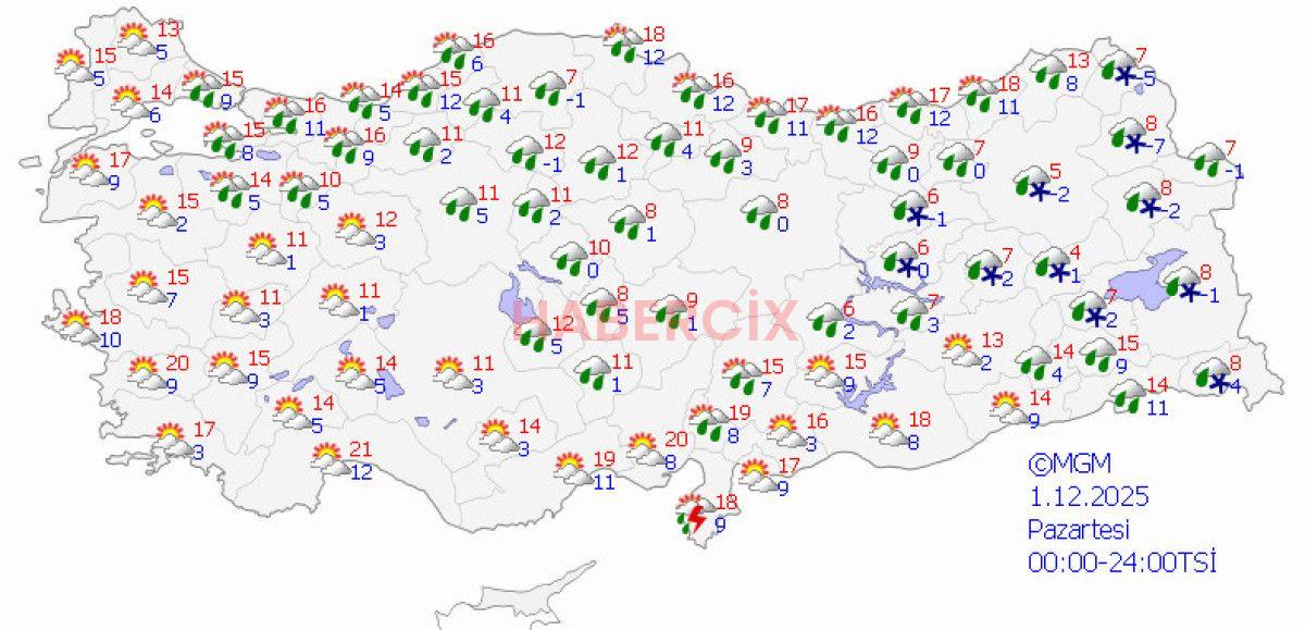 Yağışların Marmara, Ege ve Akdeniz’de gök gürültülü sağanak; İç Anadolu’nun doğusunun yüksekleri, Doğu Karadeniz’in iç kısımlarının yüksekleri ile Doğu Anadolu’nun kuzey ve doğusunun yükseklerinde karla karışık yağmur ve kar biçiminde; Mersin ve Adana etrafları ile Hatay kıyılarında lokal kuvvetli olması bekleniyor.