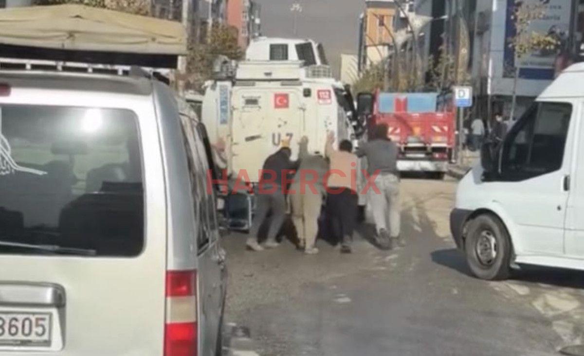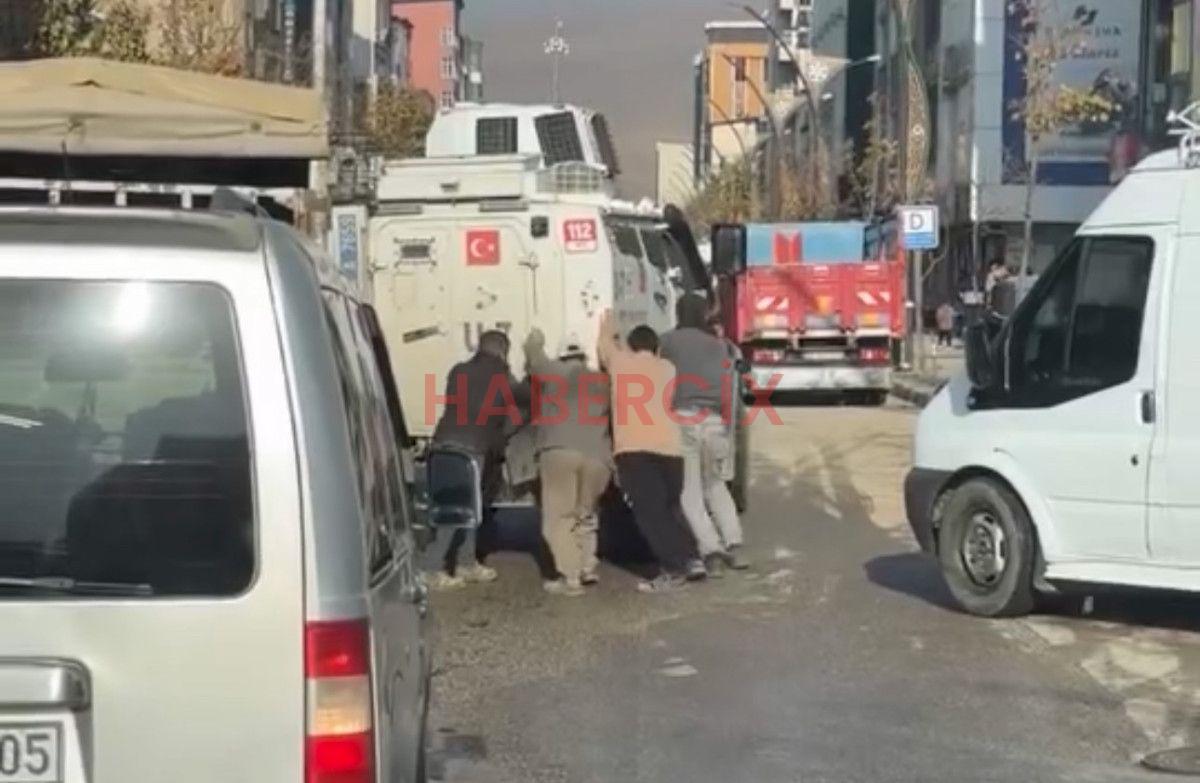 Zırhlı aracın gerisine geçen vatandaşlar, aracı birlikte iterek bulunduğu yerden kurtardılar.