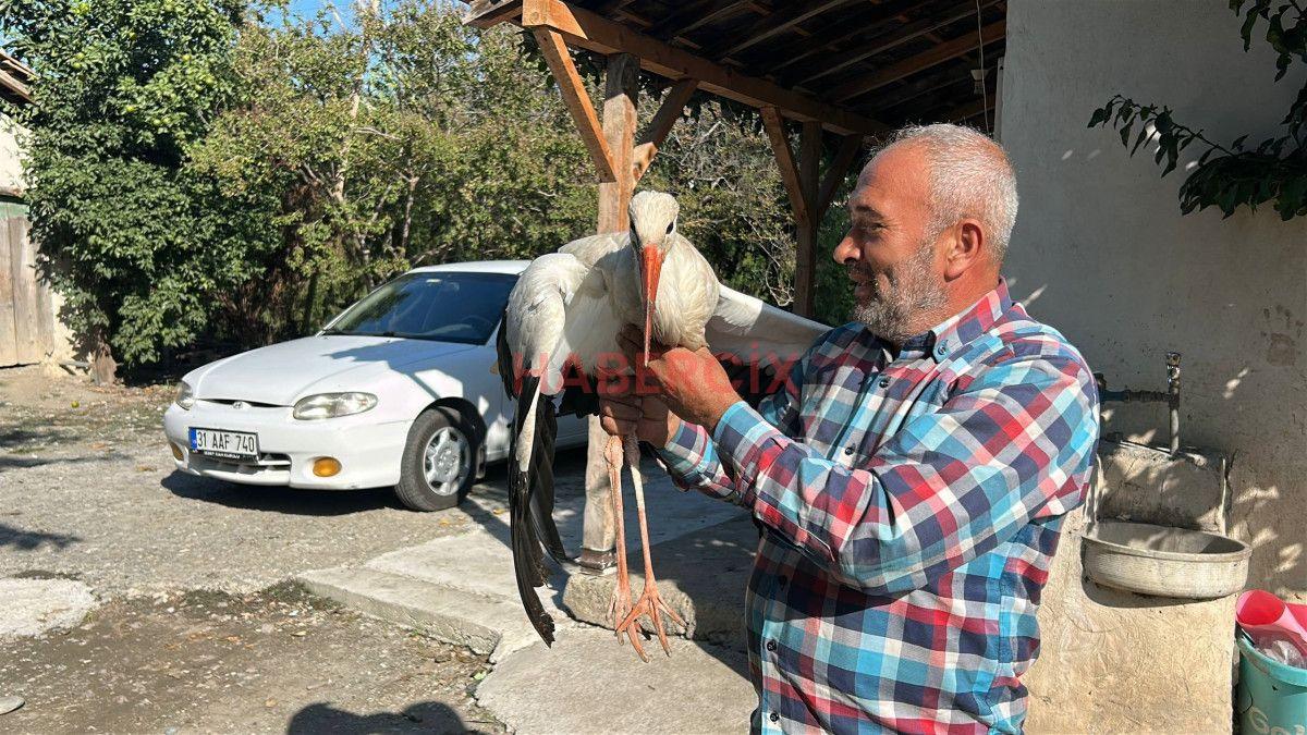 Hatay’ın Dörtyol ilçesi Numuneevler Mahallesi’nde yaşayan Yusuf Poyraz, sabah saatlerinde konutunun bahçesinde uçamaz halde olan leyleği fark etti.