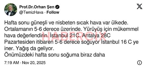 Sonbahara veda edip adım adım kış mevsimine geçiş yapıyoruz. Ancak hava sıcaklıkları “Ben daha bitmedim” der gibi… Kasım ayının sonlarına gelmişken 20 dereceyi aşan hava sıcaklıkları kış severleri üzerken meteoroloji uzmanı Prof. Dr. Orhan Şen’den ‘soğuk hava’ uyarısı geldi. Orhan Şen, hafta sonunun sıcak geçeceğini 24 Kasım Pazartesi gününden itibaren ise sıcaklıkların düşeceğini açıkladı.