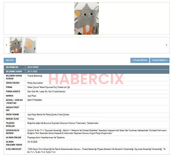 Bakanlık, “Jojo Pops” marka pelüş oyuncak serisine ait bir çocuk çantasının satışının yasaklandığını açıkladı. Yapılan testler, ürünün mekanik ve fiziksel özellikler standardını karşılamadığını ortaya koydu. Özellikle fermuar elciğinin tork testinde koparak küçük parçalar oluşturduğu ve bunun boğulma riski taşıdığı belirtildi. Bu nedenlerle söz konusu ürünün piyasadan tamamen toplatılmasına karar verildi.