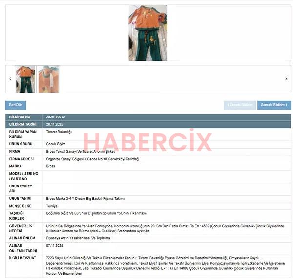 Listedeki ikinci ürün ise “Bross” marka çocuk eşofman takımı oldu. Denetimler sırasında, ürünün kordon boyunun yönetmelik sınırlarını aştığı ve bu nedenle boğulma riski oluşturduğu belirlendi. Güvenlik endişeleri nedeniyle eşofman takımının satışı yasaklandı. Ticaret Bakanlığı, tüketicilere ellerinde bu ürünlerden bulunması halinde derhal kullanımdan kaldırmaları yönünde uyarıda bulundu.