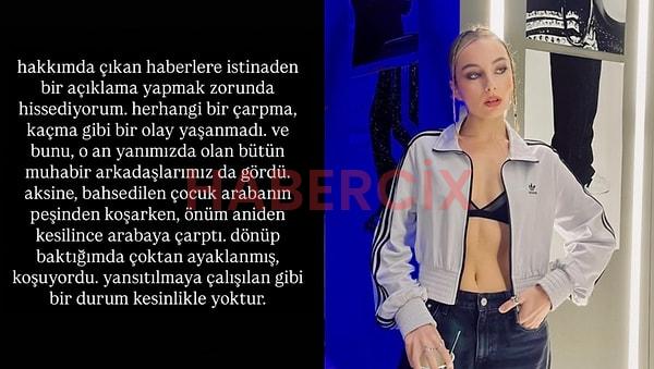 “hakkımda çıkan haberlere istinaden bir açıklama yapmak zorunda hissediyorum. herhangi bir çarpma, kaçma gibi bir olay yaşanmadı. ve bunu, o an yanımızda olan bütün muhabir arkadaşlarımız da gördü. aksine, bahsedilen çocuk arabanın peşinden koşarken, önüm aniden kesilince arabaya çarptı. dönüp baktığımda çoktan ayaklanmış, koşuyordu. yansıtılmaya çalışılan gibi bir durum kesinlikle yoktur.”