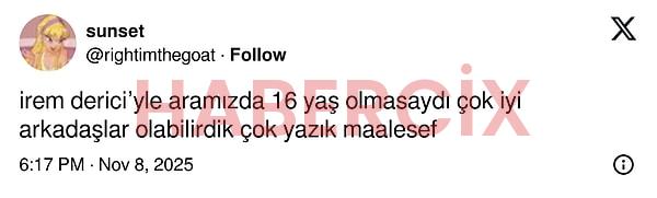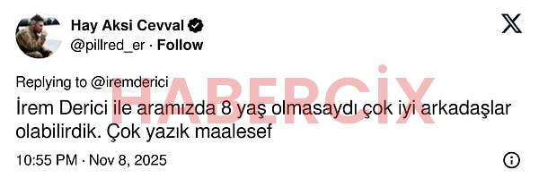 Kendisi hem ünlü isimlerle hem toplumsal medya kullanıcılarıyla tartışmaya girmekten çekinmiyor. Ortalığın karışmasına sebep olan tweet’te bir kullanıcı, ortalarında yaş farkı olmasa İrem Derici ile arkadaş olabileceklerini yazmıştı.