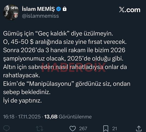 Son günlerin popüler uzmanlarından İslam Memiş, gümüş yatırımcıları ile ilgili paylaşımda bulundu.