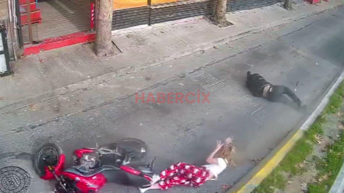 Güvenlik kamerasına yansıyan imgelerde motosiklet kullanan abinin direksiyon hakimiyetini kaybettiği ve kız kardeşiyle birlikte yere düşerek metrelerce sürüklendiği anlar yer aldı.