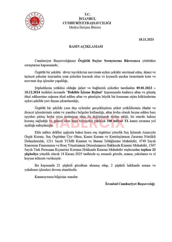 İstanbul Cumhuriyet Başsavcılığı’nca yürütülen soruşturma kapsamında, ikinci ve üçüncü şahıslar üzerinden yeni şirketler kurarak altın ve değerli maden ticaretinde kota ile mevzuat dışı süreçler yaparak 100 milyar lira kamu ziyanına neden olduğu argüman edilen cürüm örgütüne operasyon düzenlendi. Düzenlenen operasyon sonucu 21 kuşkulu gözaltına alındı.