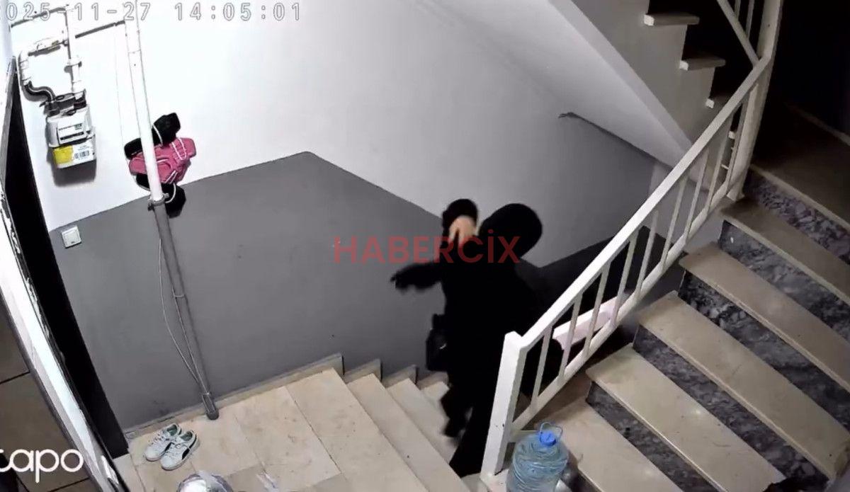 Kadınlardan biri gözcülük yaparak merdivenleri denetim ederken oburu de bir dairenin kapısını açmaya çalıştı.