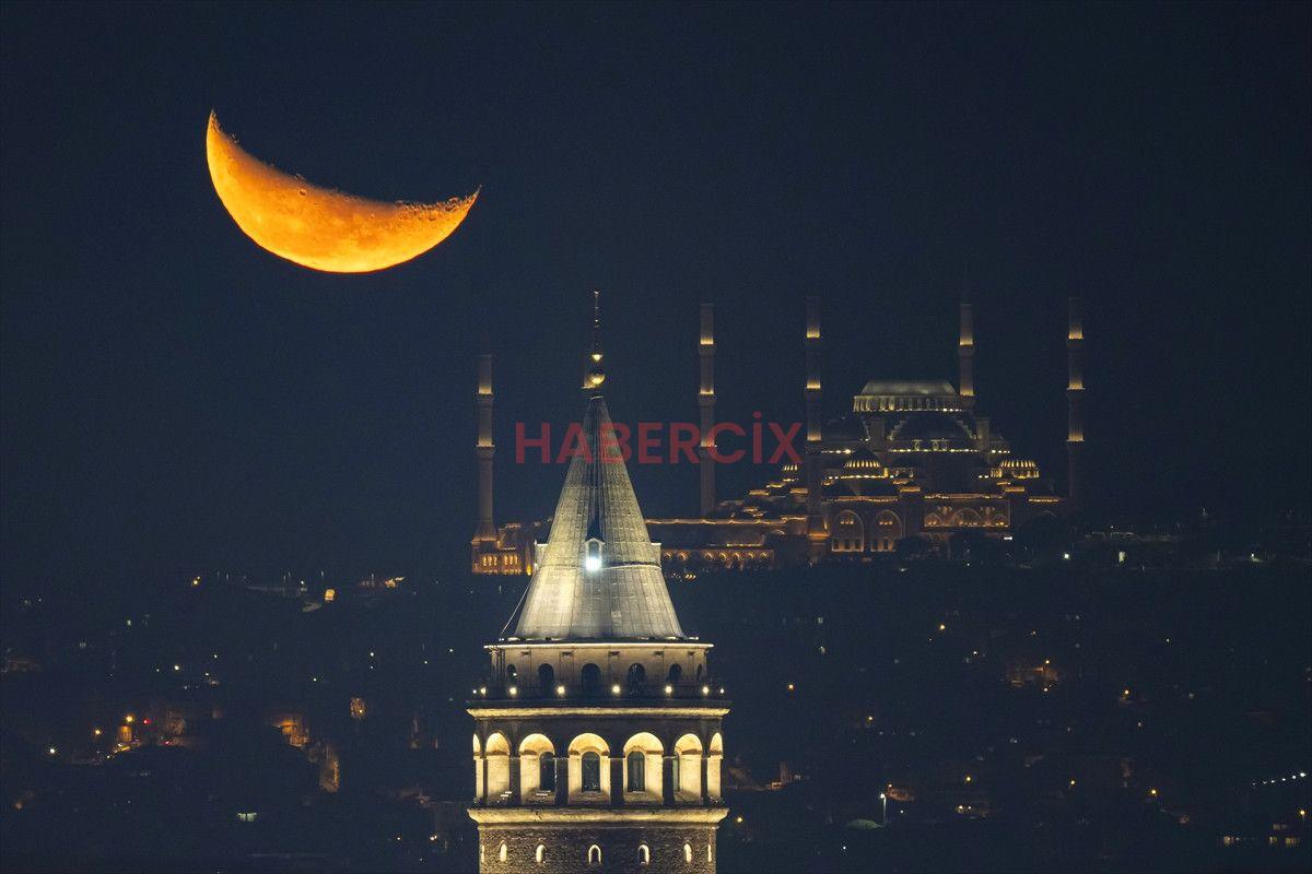 İstanbul’da akşam saatlerinde gökyüzünde beliren hilal, Galata Kulesi ile birebir karede görüntülendi.