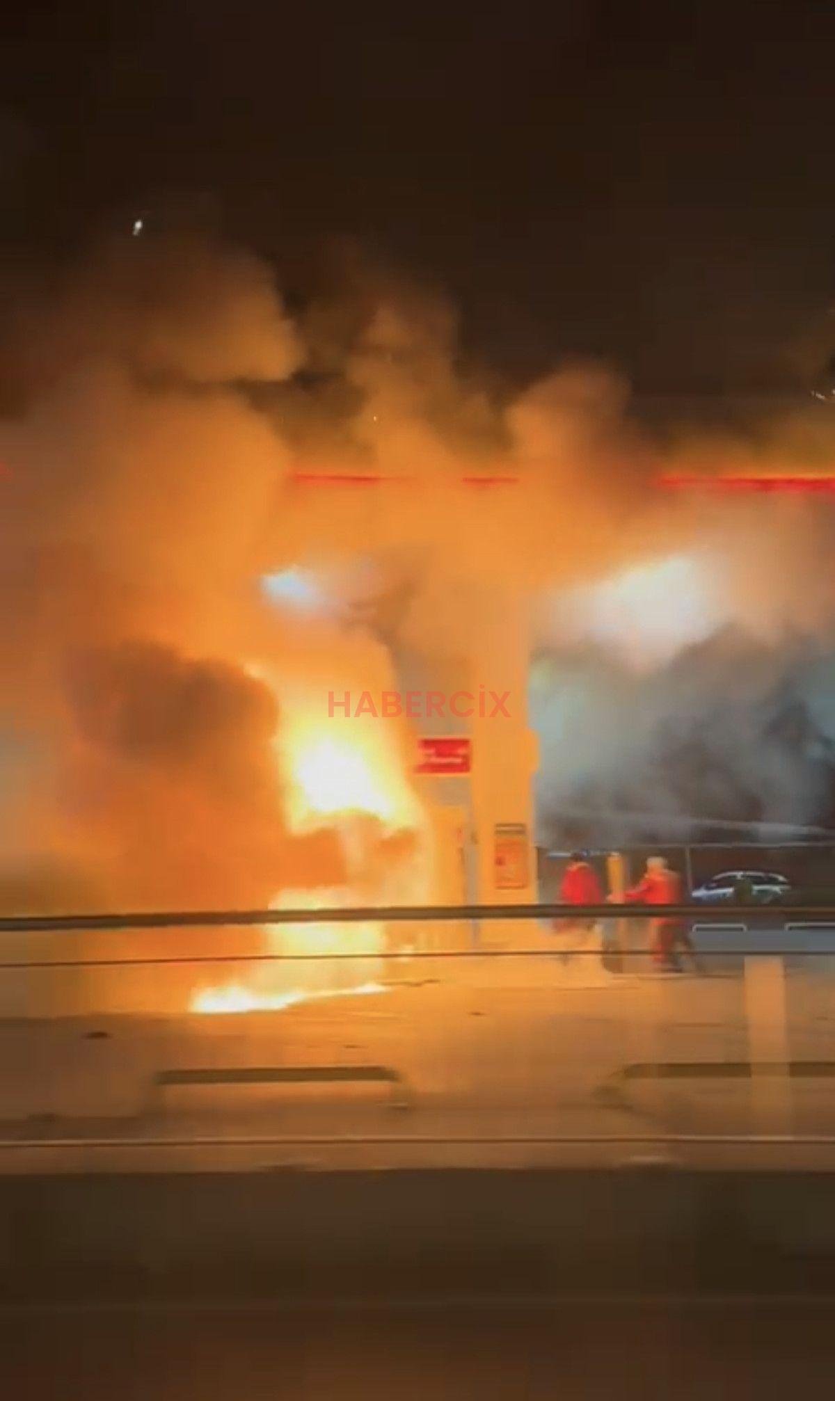 Çarpmanın ardından 34 GCD 639 plakalı otomobilde yangın çıktı. İstasyonda kısa süreli panik yaşanırken, çalışanlar yangın tüpleriyle alevlere müdahale etti.