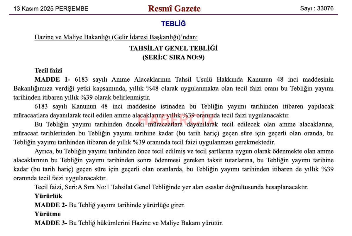 Resmi Gazete’de yayımlanan karara nazaran, 6183 sayılı Amme Alacaklarının Tahsil Yordamı Hakkında Kanunun 48’inci hususunun Hazine ve Maliye Bakanlığı’na verdiği yetki kapsamında, yıllık yüzde 48 olarak uygulanmakta olan tecil faizi oranı bu bildirimin yayımı tarihinden itibaren yıllık yüzde 39 olarak belirlendi.