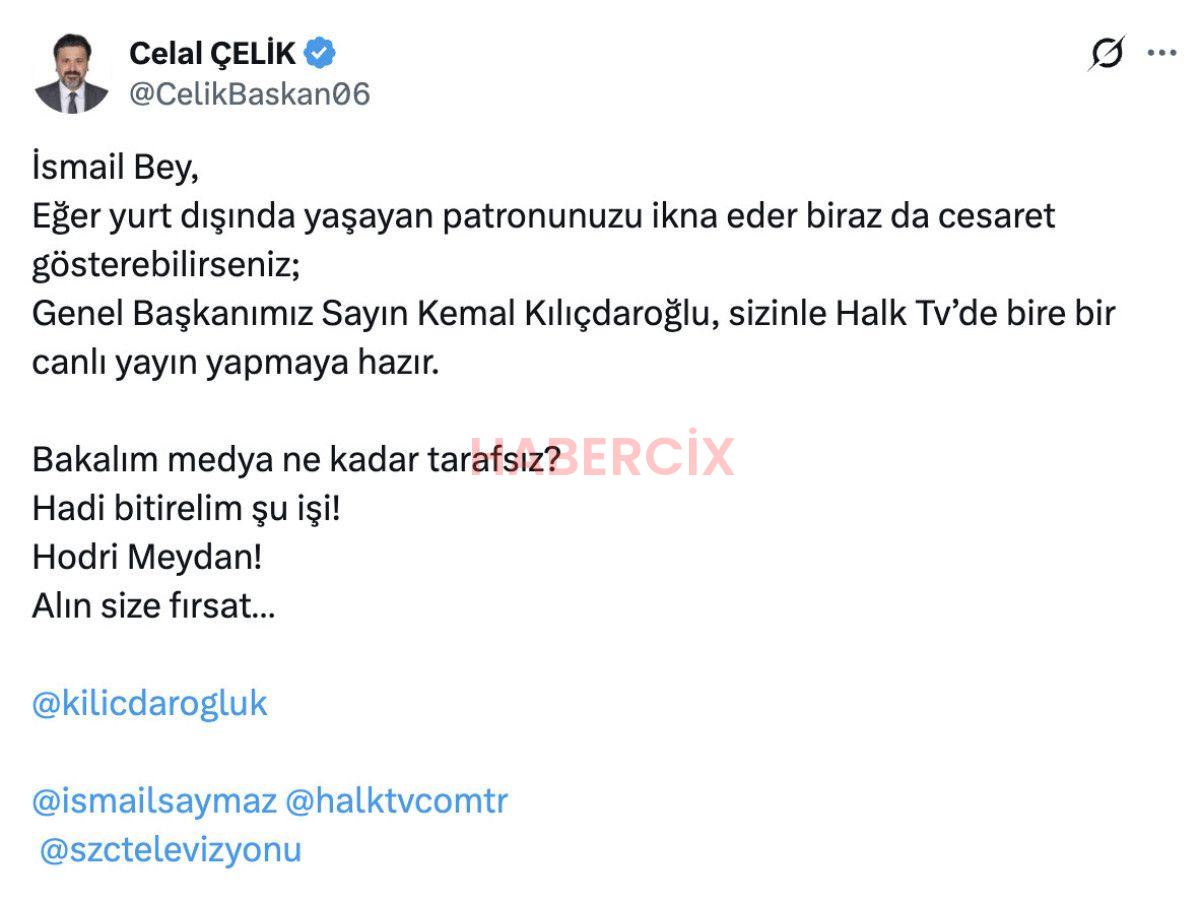 “İsmail Bey, Şayet yurt dışında yaşayan işvereninizi ikna eder biraz da cüret gösterebilirseniz; Genel Liderimiz Sayın Kemal Kılıçdaroğlu, sizinle Halk Tv’de teğe bir canlı yayın yapmaya hazır.