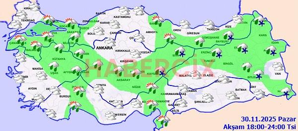 Meteoroloji Genel Müdürlüğü’nden gelen yapılan kestirimlere nazaran, ülke genelinde kesimli ve çok bulutlu, Marmara’nın güney ve doğusu, Ege, Akdeniz, İç Anadolu, Batı Karadeniz, Orta ve Doğu Karadeniz’in iç bölümleri, Doğu Anadolu(Van hariç), Güneydoğu Anadolu (Mardin hariç) ile Samsun etraflarının yağışlı havanın hakim olacağı iddia ediliyor. Yağışların sağanak ve gök gürültülü sağanak, İç Anadolu’nun doğusu, Doğu Anadolu’nun kuzey ve doğusu ile Doğu Karadeniz’in iç kesitlerinde yer yer karla karışık yağmur ve yükseklerinde kar formunda olması bekleniyor. Yağışların, Mersin, Adana etrafları ile Hatay’ın kıyı kısımlarında kuvvetli olacağı da varsayımlar ortasında yer alıyor. İç ve doğu kısımlarda sabah ve gece saatlerinde pus ve yer yer sis hadisesi görülmesi de Meteoroloji’den gelen varsayımlar ortasında.