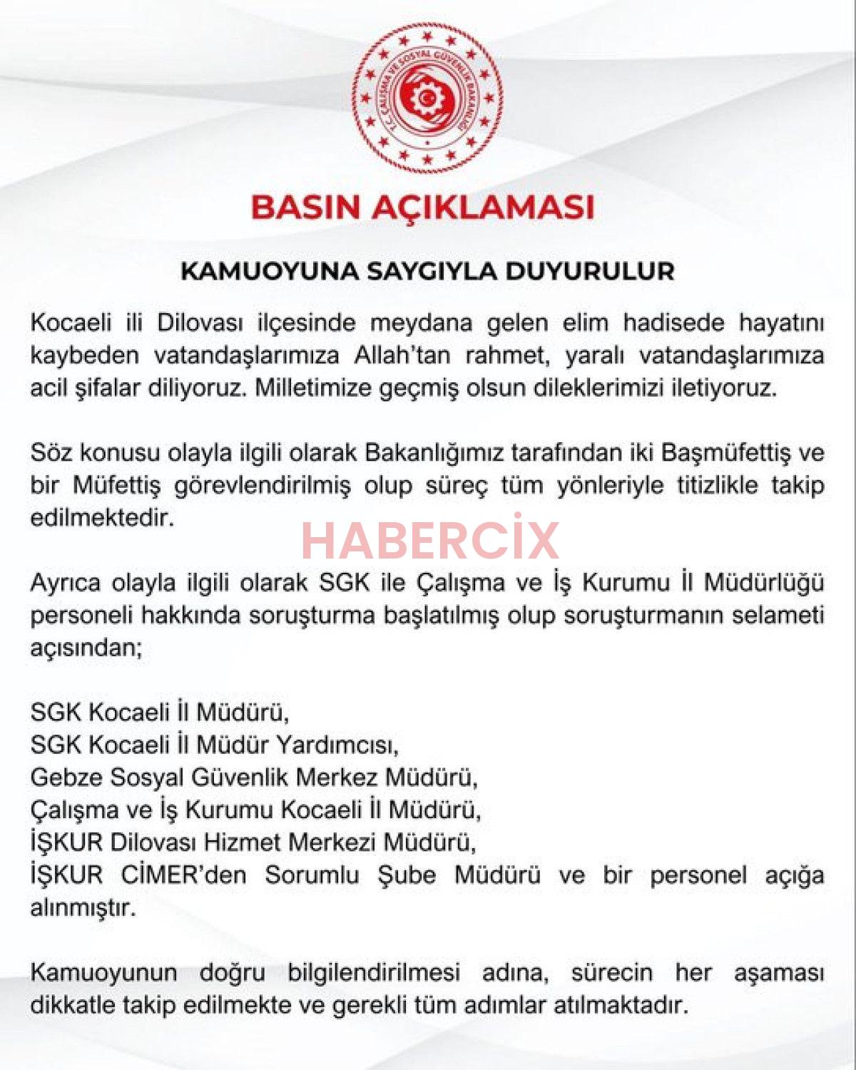 Ayrıca olayla ilgili olarak SGK ile Çalışma ve İş Kurumu İl Müdürlüğü personeli hakkında soruşturma başlatılmış olup soruşturmanın selameti açısından;