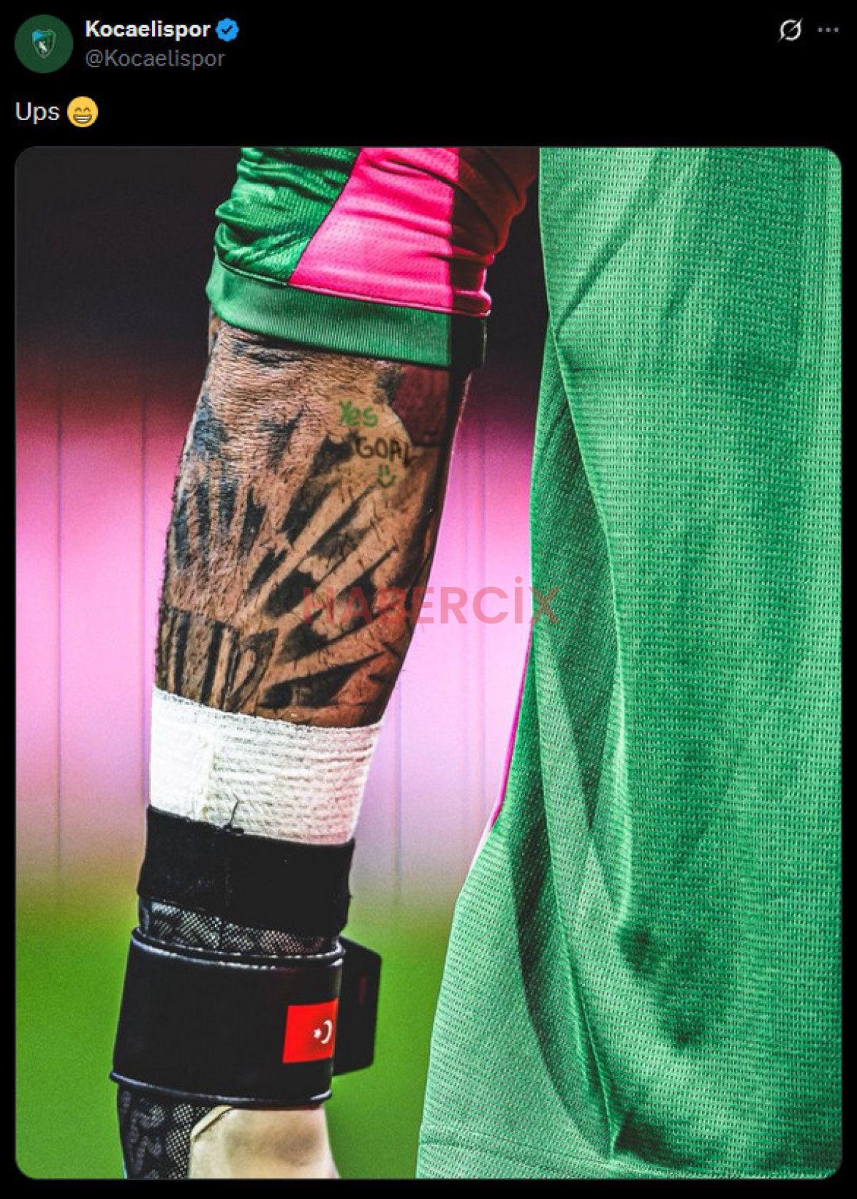 Yeşil-siyahlı kulüp, ulusal kalecinin kolunda yer alan ‘No Goal’ dövmesinin görüldüğü fotoğrafı toplumsal medyada paylaşarak ‘Ups’ notunu ekledi.