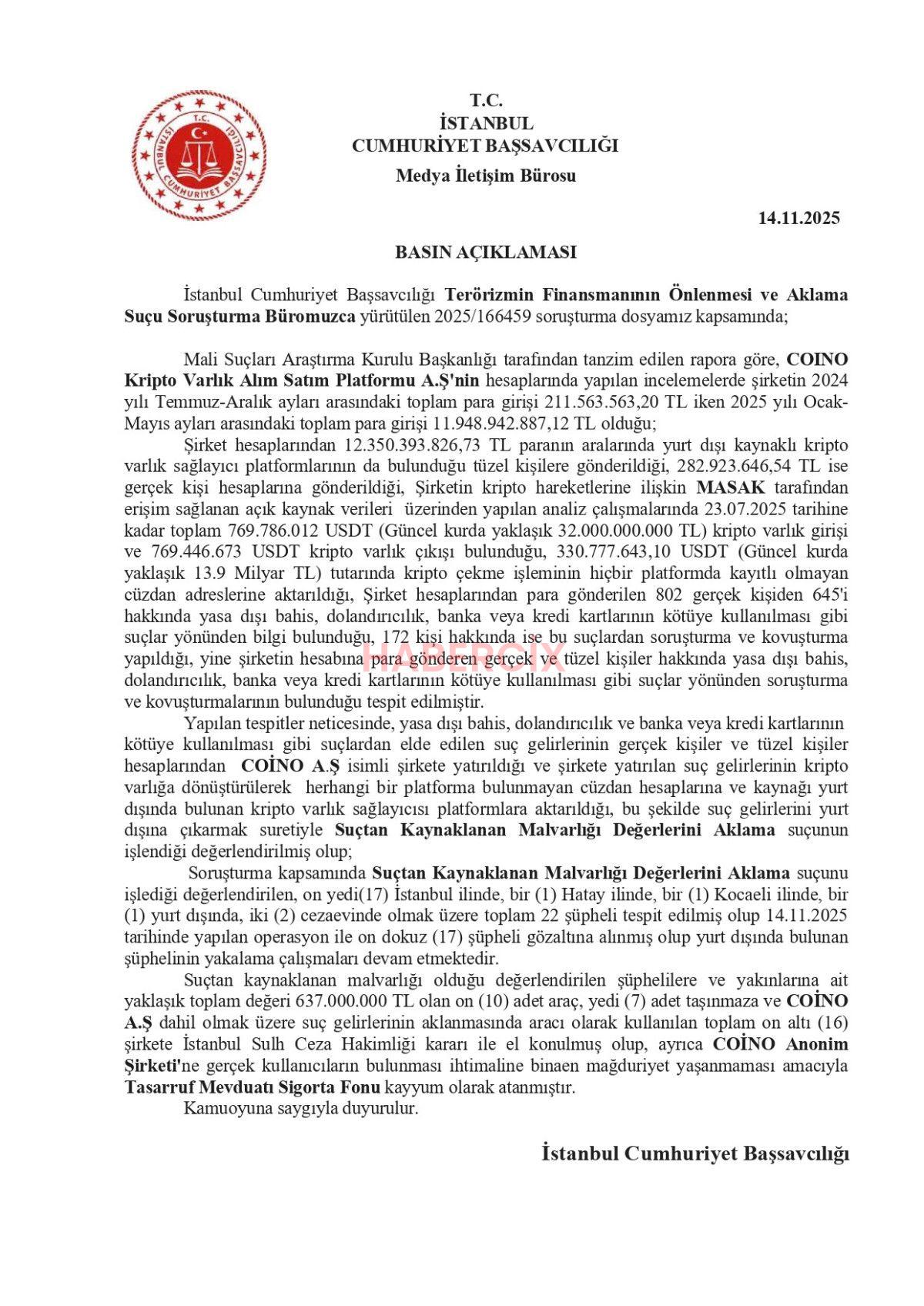 İstanbul Cumhuriyet Başsavcılığı Terörizmin Finansmanının Önlenmesi ve Aklama Kabahati Soruşturma Ofisi, COINO Kripto Varlık Alım Satım Platformu A.Ş. üzerinden yürütülen geniş çaplı aklama soruşturmasında 22 kuşkulu tespit edildiğini, 14 Kasım 2025 tarihinde düzenlenen operasyonla 17 kişinin gözaltına alındığını açıkladı.