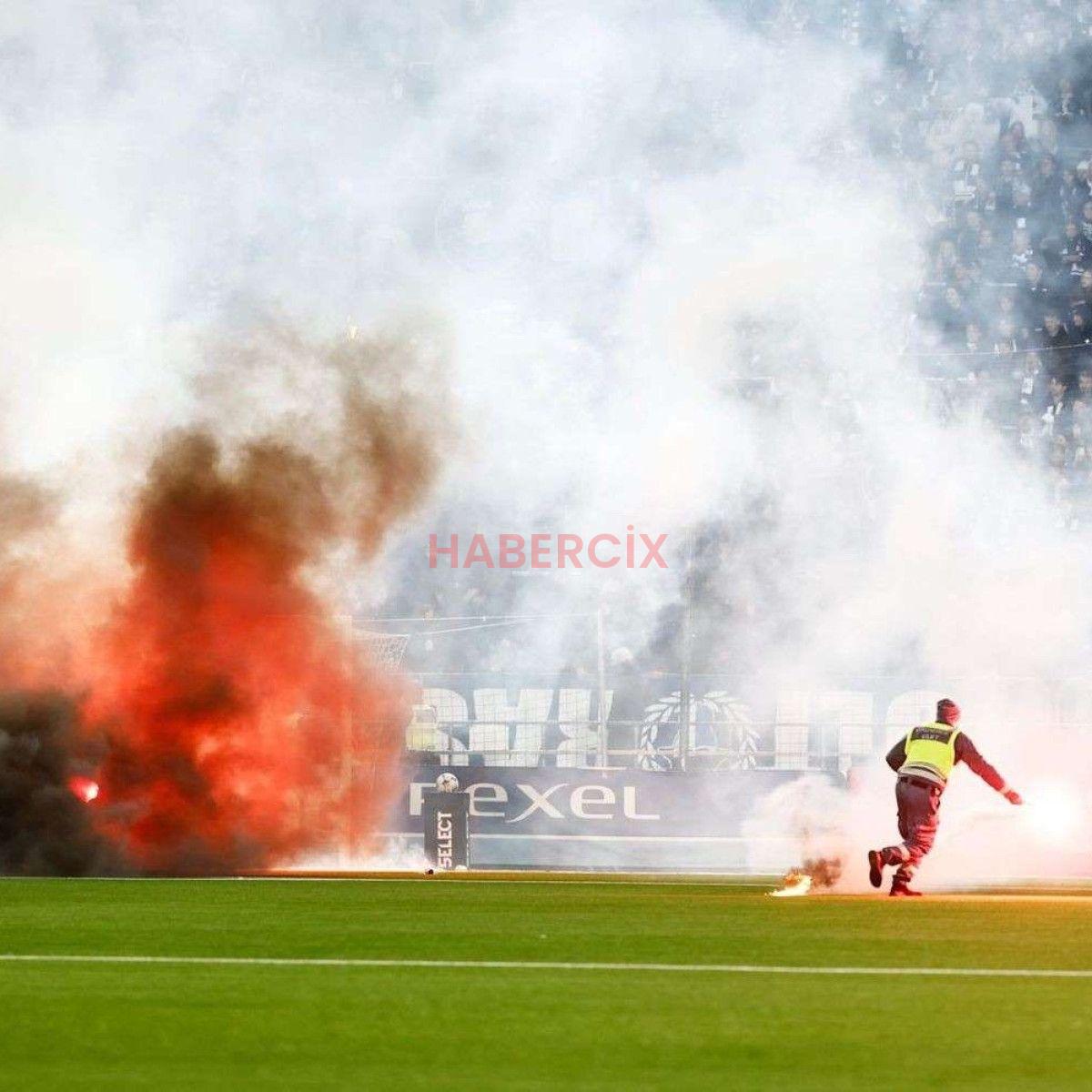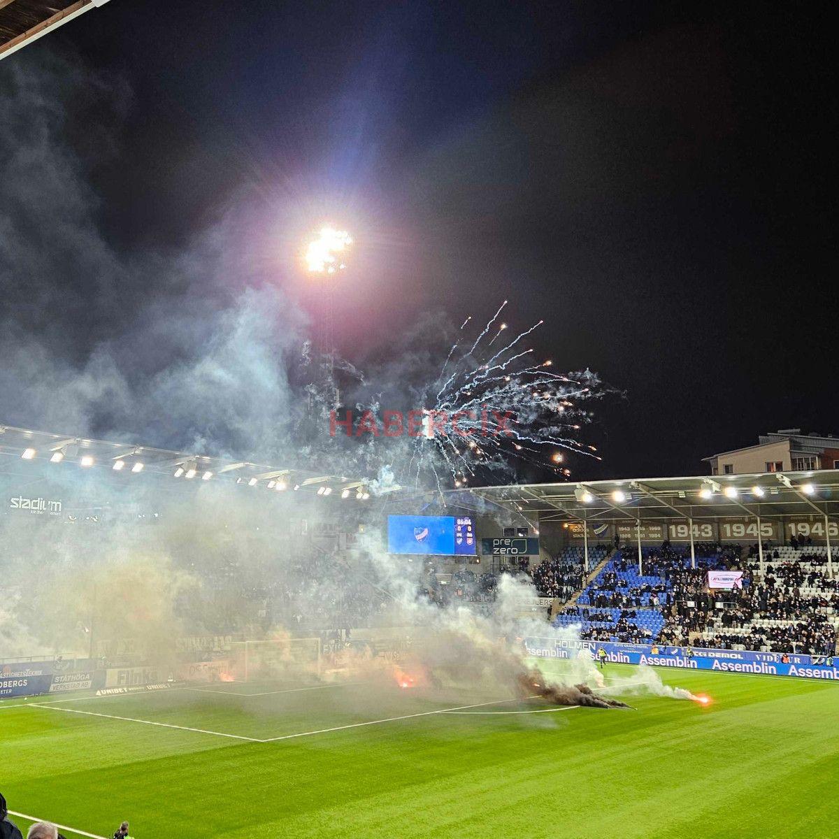 İlk maçı 3-0 kaybeden Norrköping’in alanında oynanan rövanş çabasında, gruplarının küme düşmesine reaksiyon gösteren konut sahibi grubun taraftarları, 85. dakikada yapay çim tabana yanıcı husus atmaya başladı.