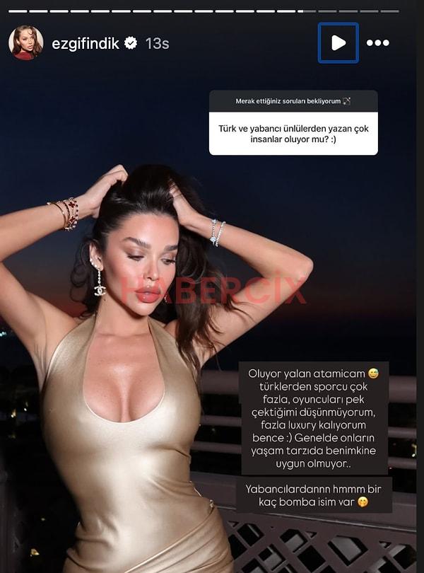 Ezgi Fındık, dün akşam Instagram’da yaptığı soru–cevap serisiyle yine sosyal medyanın odağına yerleşti. Takipçilerinden gelen soruları yanıtlayan Fındık, özellikle “Türk ve yabancı ünlülerden sana yazan çok oluyor mu?” sorusuna verdiği cevapla gündeme oturdu. Kendisine mesaj atan isimler arasında özellikle Türk sporcuların öne çıktığını, oyunculardan ise pek hoşlanmadığını ima etti.