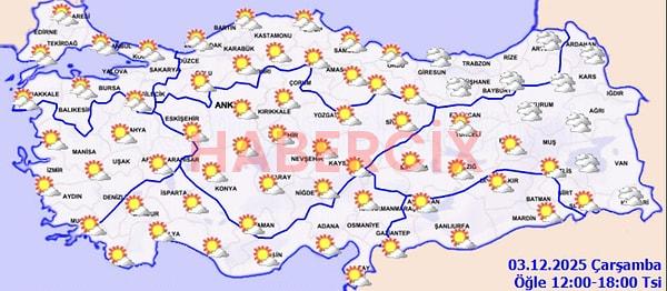 Meteoroloji Genel Müdürlüğü (MGM), 3 Aralık hava durumunu açıkladı. Meteoroloji’nin hava varsayım haritasına nazaran bugün ülke geneli güneşli olacak. Yapılan açıklamada sıcaklıkların mevsim normalleri üzerinde seyredeceği belirtildi. MGM tarafından yapılan iddialara nazaran ülke genelinde yağış beklenmiyor. kuzey ve batı kısımlarının kesimli bulutlu, başka yerlerin az bulutlu ve açık geçeceği kestirim ediliyor geçeceği varsayım ediliyor.