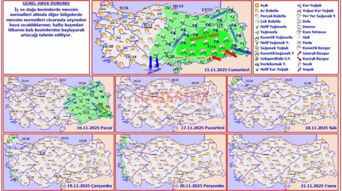 Rapora göre ülke genelinin parçalı ve çok bulutlu, Marmara’nın doğusu, Doğu Akdeniz, İç Anadolu’nun doğusu, Karadeniz, Doğu Anadolu’nun kuzey ve batısı ile Güneydoğu Anadolu çevrelerinin yağmur ve sağanak yağışlı, Doğu Karadeniz’in iç kesimlerinin yüksekleri ile Doğu Anadolu’nun kuzey kesimlerinin yükseklerinin karla karışık yağmur ve yer yer kar yağışlı geçeceği tahmin ediliyor.