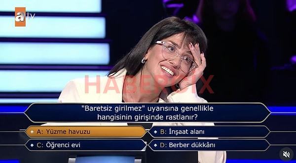 ‘Baretsiz girilemez’ ihtarına çoklukla hangisinin girişinde rastlanır? sorusuna cevap veren yarışmacı, kendinden emin bir biçimde ‘İnşaat alanı’ yerine, ‘Yüzme havuzu’ şıkkını seçti.
