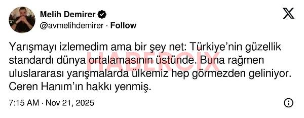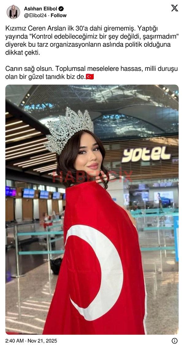 Miss Universe 2025 yarışmasının sonuçları açıklanır açıklanmaz sosyal medya adeta alev aldı. Meksika güzeli Fatima Bosch’un birincilik tacını takmasının ardından gözler Türkiye’yi temsil eden Ceren Arslan’a çevrildi. Ancak Arslan’ın yarışmada ilk 30’a dahi sokulmaması, herkesi şaşkına çevirdi. Sosyal medya hesabından açıklama yapan ve duygularını dile getiren temsilcimize destek mesajları yağdı.