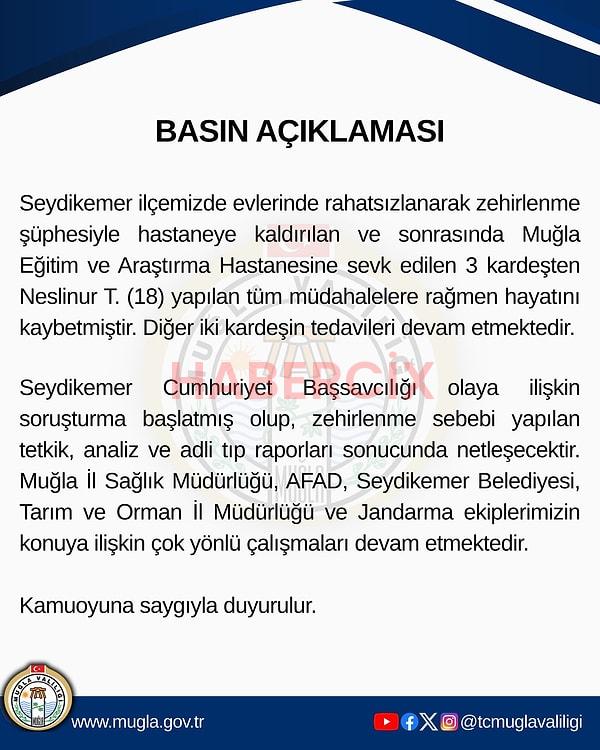 Muğla’nın Seydikemer ilçesinde evde yedikleri tavuk yemeği sonrasında fenalaşan 3 kardeşten 18 yaşındaki Neslinur Topal tüm müdahalelere rağmen kurtulamadı. Hayatı tehlikesi bulunan 12 yaşındaki R.T. ile 10 yaşındaki F.T.’nin ise hastanedeki yaşam savaşı devam ediyor. Valilikten yapılan açıklamada, olayla ilgili çok yönlü soruşturmanın sürdüğü duyuruldu.
