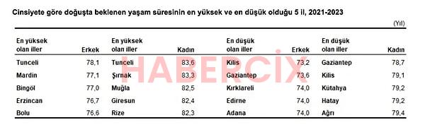 Kadın ve erkek hayat beklentilerinin başka ayrı değerlendirildiği listede birinci sıraya yerleşen vilayet Tunceli oldu. Sessiz hayat ritmi, pak hava, doğal beslenme alışkanlıkları ve düşük gerilim düzeyi sayesinde kent, Türkiye’nin en uzun ömürlü nüfusuna konut sahipliği yapıyor.