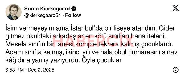 ‘İsim vermeyeyim lakin İstanbul’da bir liseye atandım. Sarfiyat gitmez okuldaki arkadaşlar en makûs sınıfları bana iteledi. Mesela sınıfın bir tanesi tam tekrara kalmış çocuklardı. Adam sınıfta kalmış, ikinci yılı ve hala okul numarasını imtihan kâğıdına yanlış yazıyordu. O denli çocuklar var.