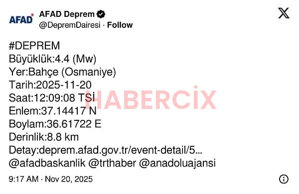 AFAD verilerine göre saat 12.09 sıralarında Osmaniye’nin Bahçe ilçesinde 8 kilometre derinlikte 4.4 büyüklüğünde deprem yaşandı. Kandili Rasathanesi de depremin büyüklüğünü 4.4 olarak paylaştı.