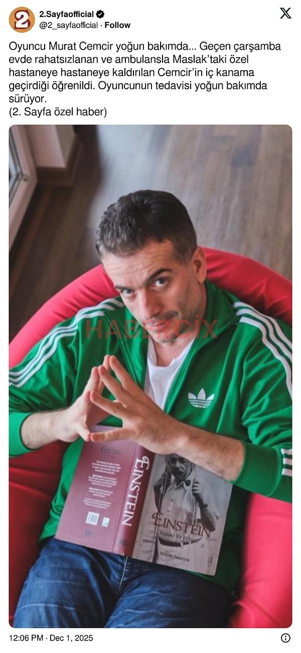 ‘Oyuncu Murat Cemcir yoğun bakımda… Geçen çarşamba evde rahatsızlanan ve ambulansla Maslak’taki özel hastaneye hastaneye kaldırılan Cemcir’in iç kanama geçirdiği öğrenildi. Oyuncunun tedavisi yoğun bakımda sürüyor.’