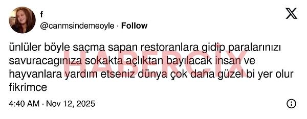 “Bir çorba geldi, bir kaşık. Tatlı şu kadarcıktı. Glutensiz, laktozsuz falan… 15 dakika anlatıyorlar ama 2 dakikada bitecek yemek geliyor.” şeklinde gittikleri restorandaki deneyimini paylaşan Nilsu Berfin Aktaş’ın sözleri X ahalisini de ayaklandırdı.