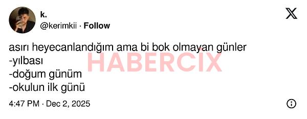 X veya özlediğimiz adıyla Twitter’da yapılan komik paylaşımlar tüm sosyal medyayı besliyor. Buradan çıkan paylaşımlar farklı mecralarda bile insanları güldürüyor. Bu da X’i mizahın en önemli kaynağı haline getiriyor. Her gün olduğu gibi bugün de akımlarıyla, şakalarıyla mizahın nabzı hızlı attı. Bakalım 3 Aralık Çarşamba günü hangi paylaşımlar öne çıktı? Nelere gülündü?