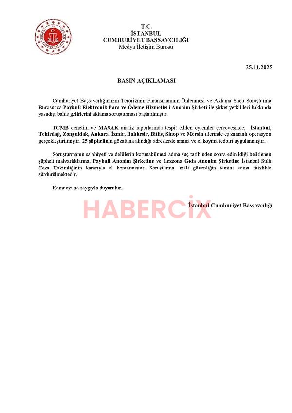 Paybull Elektronik Para ve Ödeme Hizmetleri AŞ ile şirket yetkilileri hakkında başlatılan yasa dışı bahis gelirlerini aklama soruşturmasında 25 zanlı gözaltına alındı.