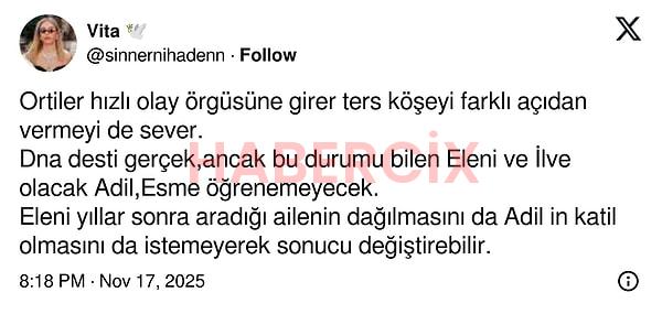 Esme’nin Eleni’nin kendi kızı olduğuna dair kuşkuları, Koçari’nin de birebir hislere kapılmasına yol açıyor. Esme’nin DNA testi yaptırmalarını istemelerinin akabinde kısımda Adil, Esme’den 20 yıl evvel ayrıldığında gebe olduğunu öğreniyor. Bebekle ilgili kuşkular artarken Adil intikam yeminleri ediyor. Lakin alışılmış Esme’ye etmesi bir ölçü üzse de gerçeklerin bir gün ortaya çıkacağına dair inancımızı yitirmiyoruz.