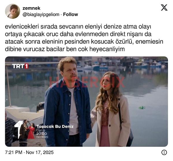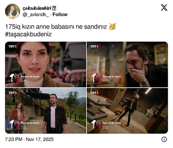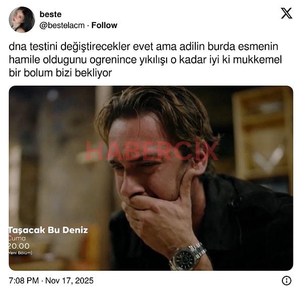 Taşacak Bu Deniz’in 7. kısmında Esme ve Adil gerçeğe yaklaşırken, kısımda neler yaşanacağı merak konusu oldu. Eleni’nin kızları olduğunu öğrenmelerine ramak kalan Esme ve Adil’in birbirleriyle ilgili gerçekleri ne vakit öğrenecekleri tartışılırken, dizinin yeni kısmının yeni bir reyting rekoru getireceğine inanıldı.