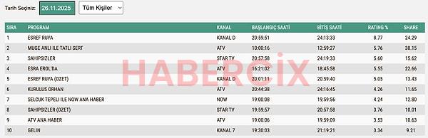 26 Kasım Çarşamba TOTAL reyting sonuçları: