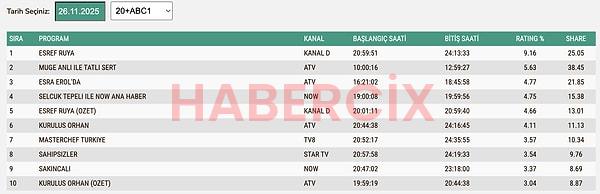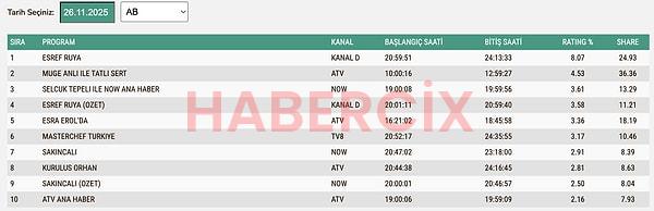 26 Kasım Çarşamba ABC1 reyting sonuçları:
