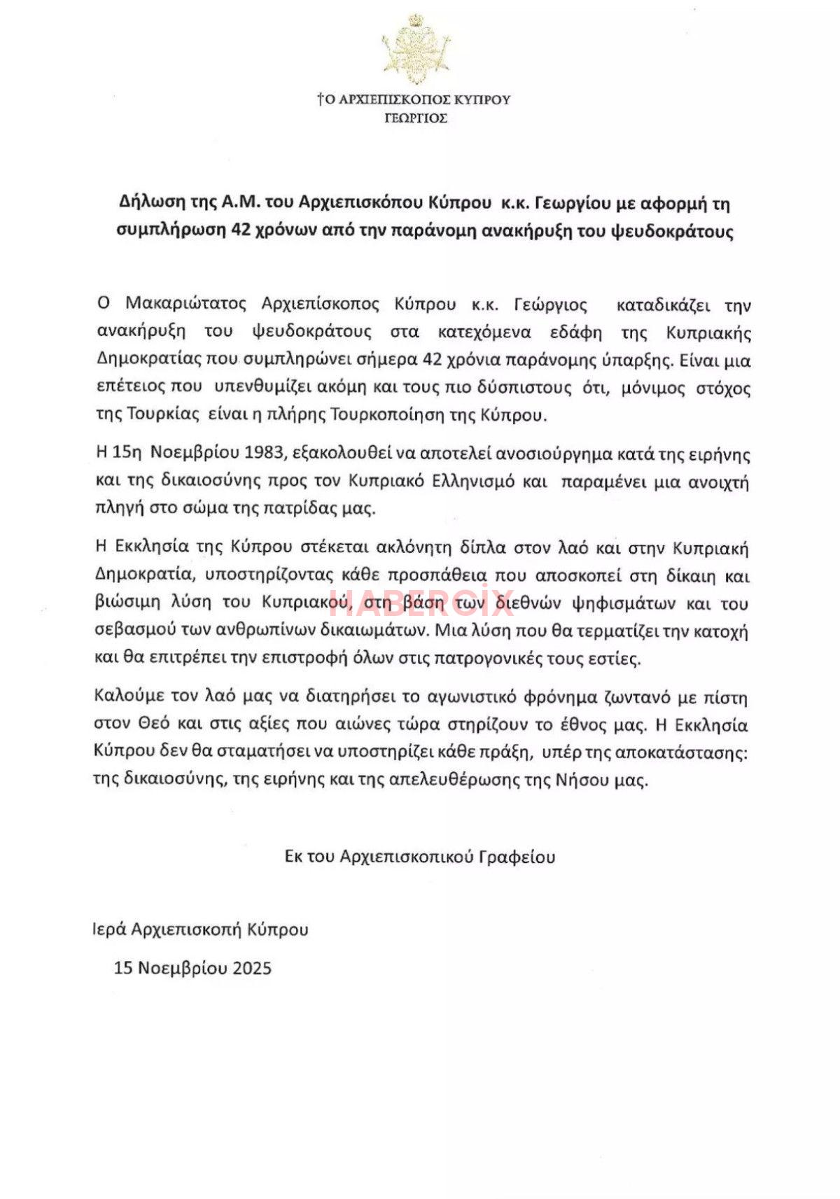Başpiskopos Georgios, “15 Kasım 1983, Kıbrıs Helenizm’ine karşı barışa ve adalete yönelik bir hakaret olmaya devam etmekte ve vatanımızın bedeninde açık bir yara olarak kalmaktadır.” dedi.
