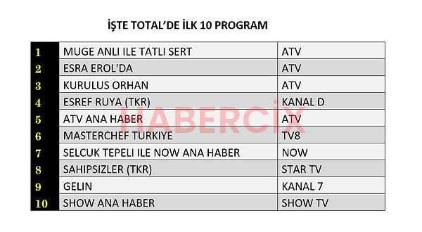 12 Kasım Çarşamba TOTAL, AB, ABC1 Reyting Sonuçları: