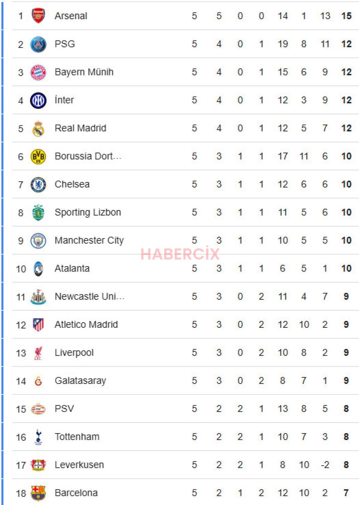 Bayern Münih’i 3-1 yenerek 5’te 5 yapan Arsenal, 15 puanla dorukta tek kaldı.