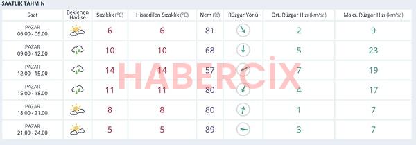 09.00-12.00 ortasında sıcaklık 10 dereceye yükseliyor. Günün en ılık saatleri ise öğlen saatleri olacak. 12.00-15.00 aralığında sıcaklık 14 dereceye kadar çıkarak günün doruğuna ulaşıyor. Lakin bu saatlerde kısa müddetli yağmur bekleniyor. 15.00-18.00 saatleri ortasında yağış tesirini artırarak devam ediyor. Sıcaklık 11 dereceye düşüyor. Akşam saatlerine gelindiğinde yağışlar duruyor lakin hava yine soğuyor. 18.00-21.00 aralığında sıcaklık 8 dereceye düşerken gece saatlerinde termometreler 5 dereceyi gösterecek.